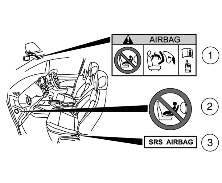 - Etiquette d'avertissement d'airbag latéral de SRS : L'étiquette d'avertissement est située sur la partie latérale du montant central côté passager et sur la base des sièges avant.