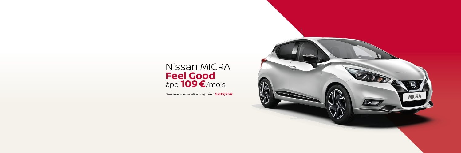 EXEMPLE ILLUSTRATIF : pour une Nissan Micra Feel Good avec extension de garantie inclus (5 ans / 100.000km) : 21315€ TVAc, acompte 5278,35€, prime de recyclage conditionnelle de 1500€ et remise supplémentaire de 3550€. Montant du prêt (acompte et remise déduites) : 10986,65€, pour une durée de 60 mois. 59 mensualités de 109€ dont 7,92€ pour l'option extension de garantie, dernière mensualité majorée de 5801,75€, montant total dû (hors acompte): 12232,75€.