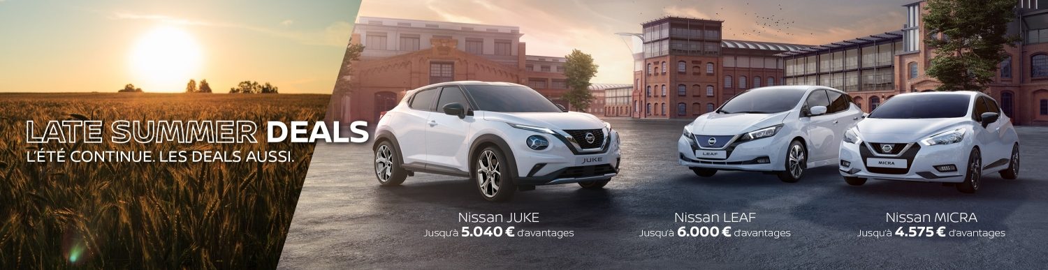 Les offres (1) à (3) sont valables uniquement pour les clients particuliers et clients professionnels (hors leasing) du 01/09/2021 au 30/09/2021 à l’achat d’une Nissan LEAF chez les concessionnaires Nissan participants. Les offres ne pourront en aucun cas être échangées contre leurs valeurs en espèces ou contre toute autre dotation/contrepartie de quelque nature que ce soit, ni remplacées par un avantage de valeur équivalente.